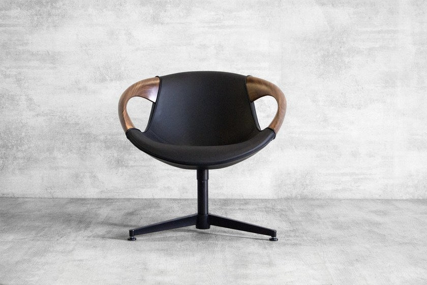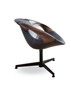 Materials: Die-cast aluminum base in polished aluminum or black. Freeform advanced injected foam shell. Arms in oak or black American walnut. Upholstered in leather. Swivel with memory return.